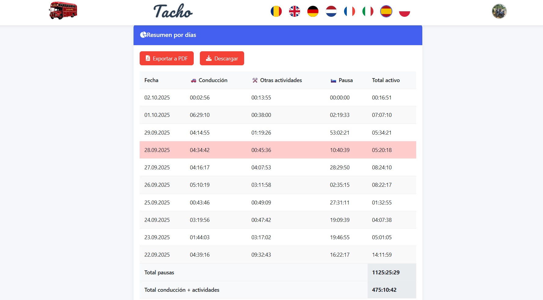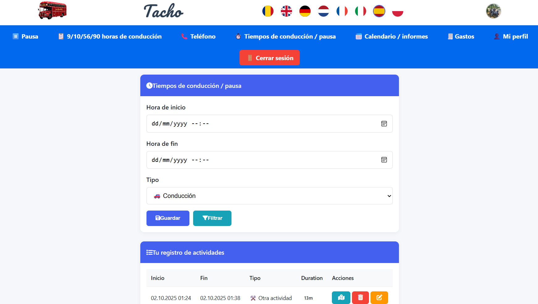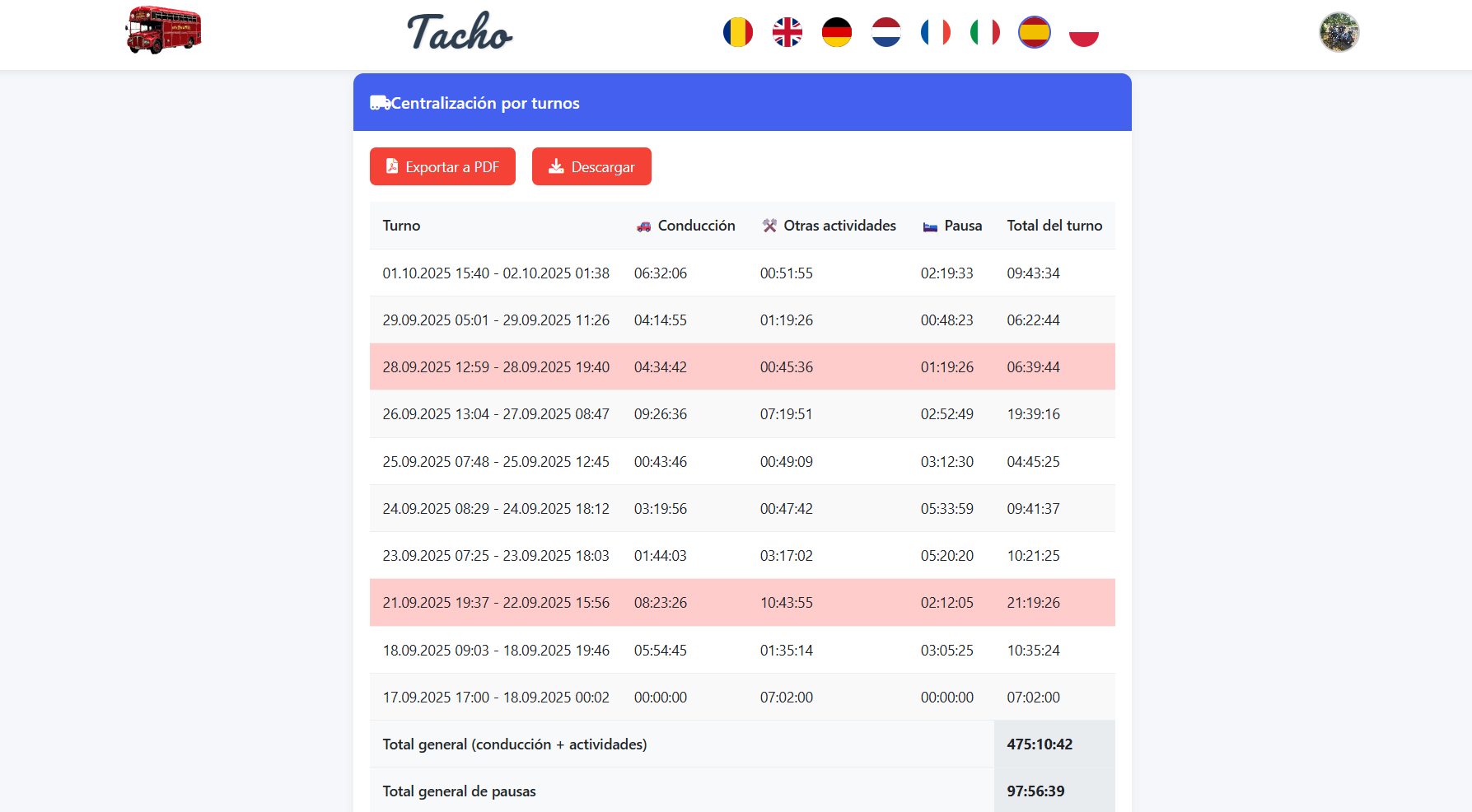 Esta aplicación está destinada a conductores profesionales y empresas de transporte que desean gestionar de forma eficiente los tiempos de conducción, pausas y actividades diarias.