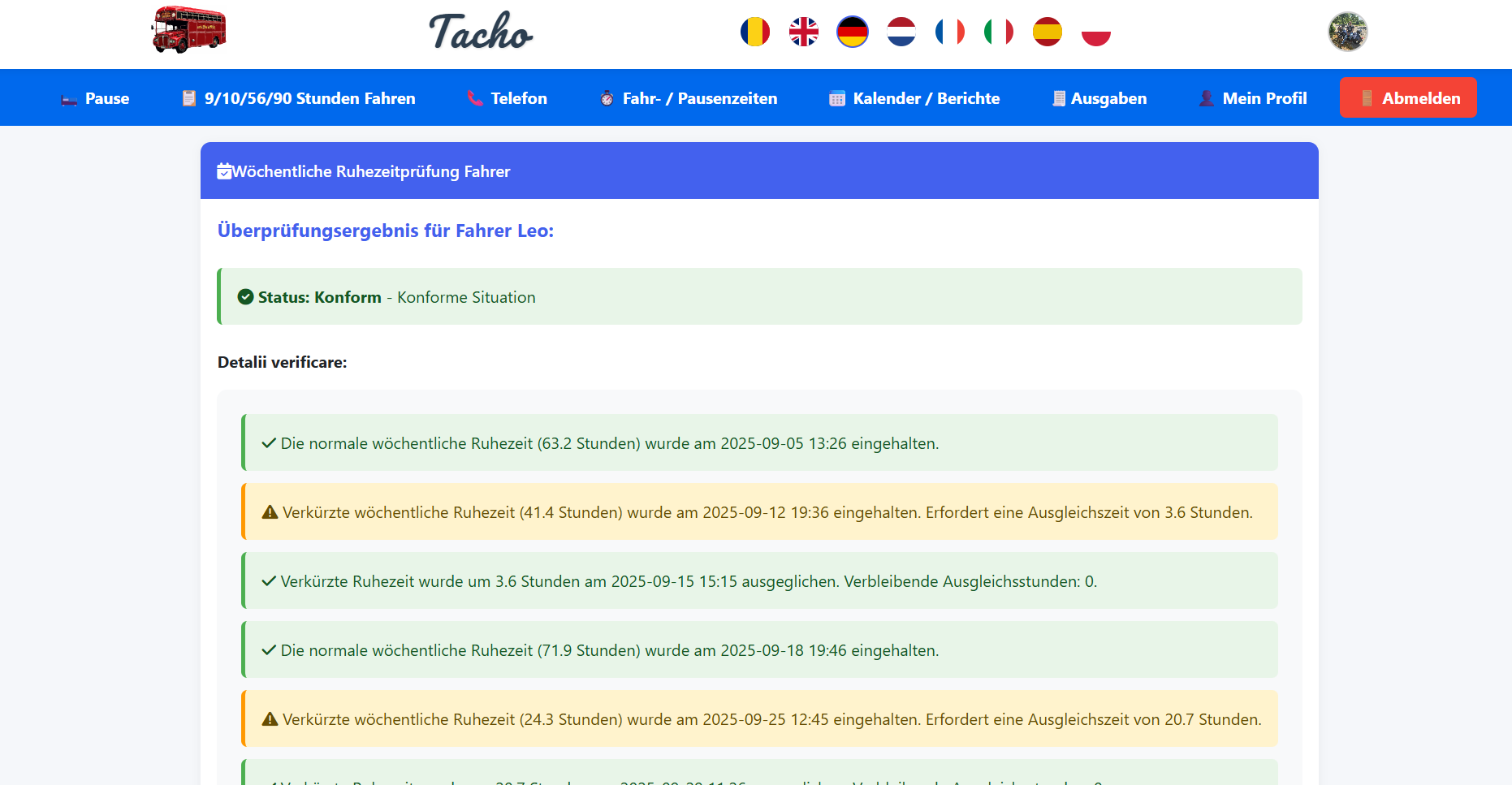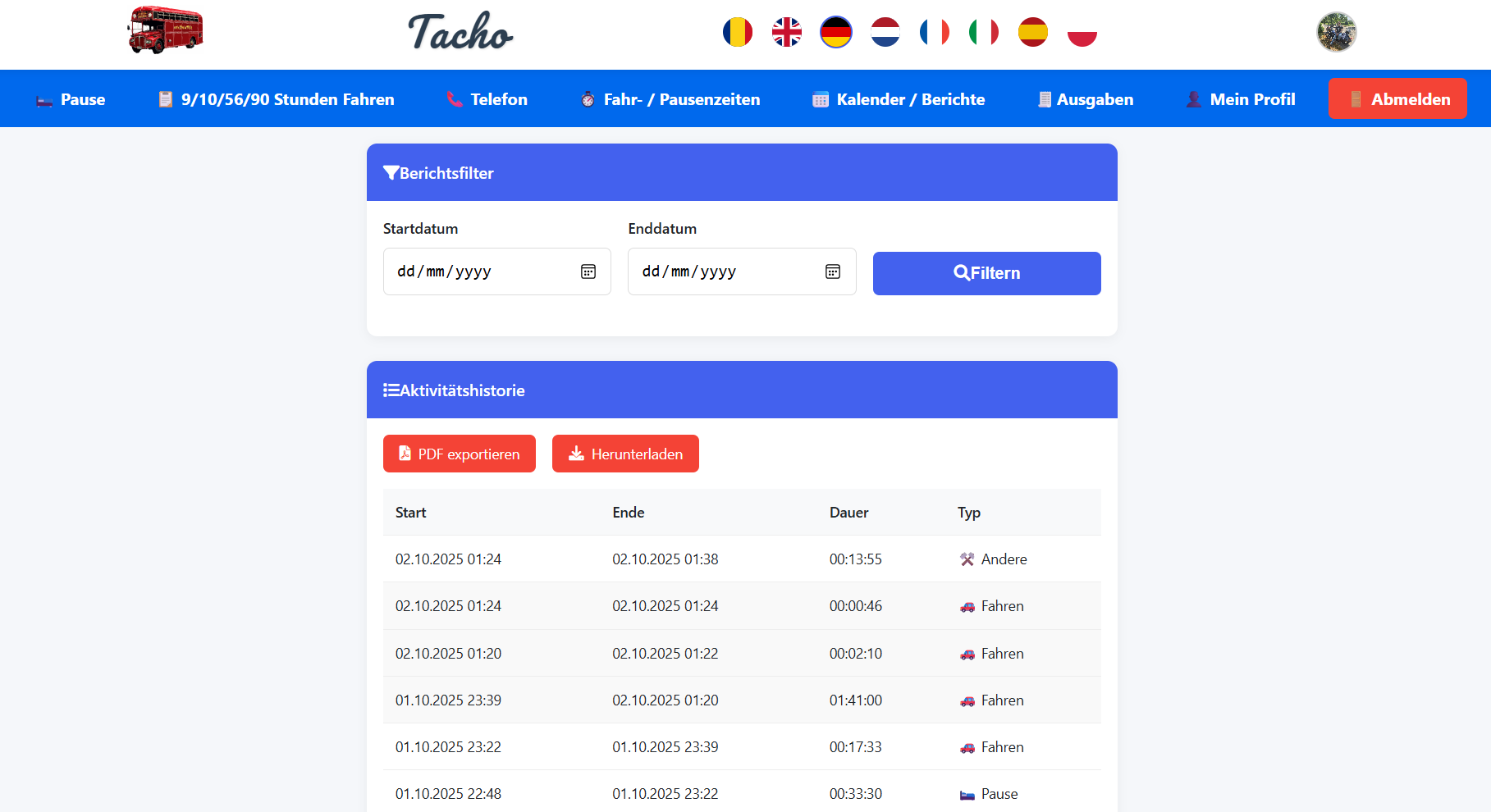 Diese Anwendung richtet sich an Berufskraftfahrer und Transportunternehmen, die ihre Lenkzeiten, Pausen und täglichen Aktivitäten effizient verwalten möchten.