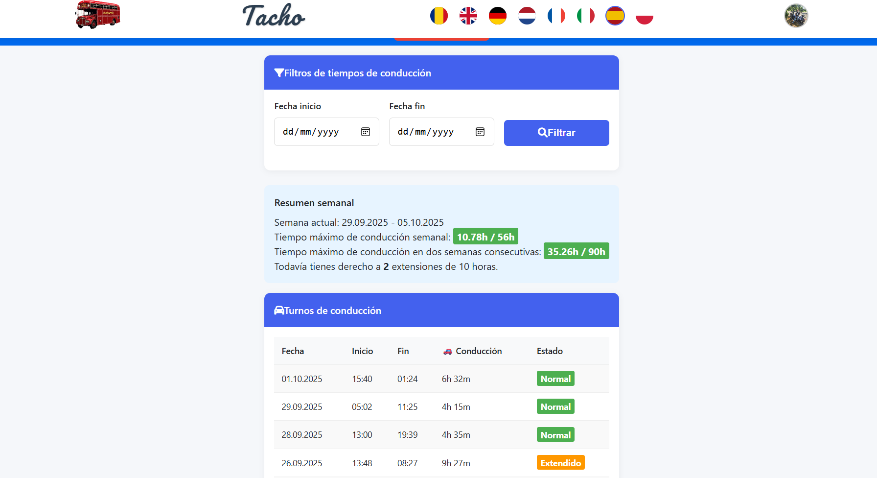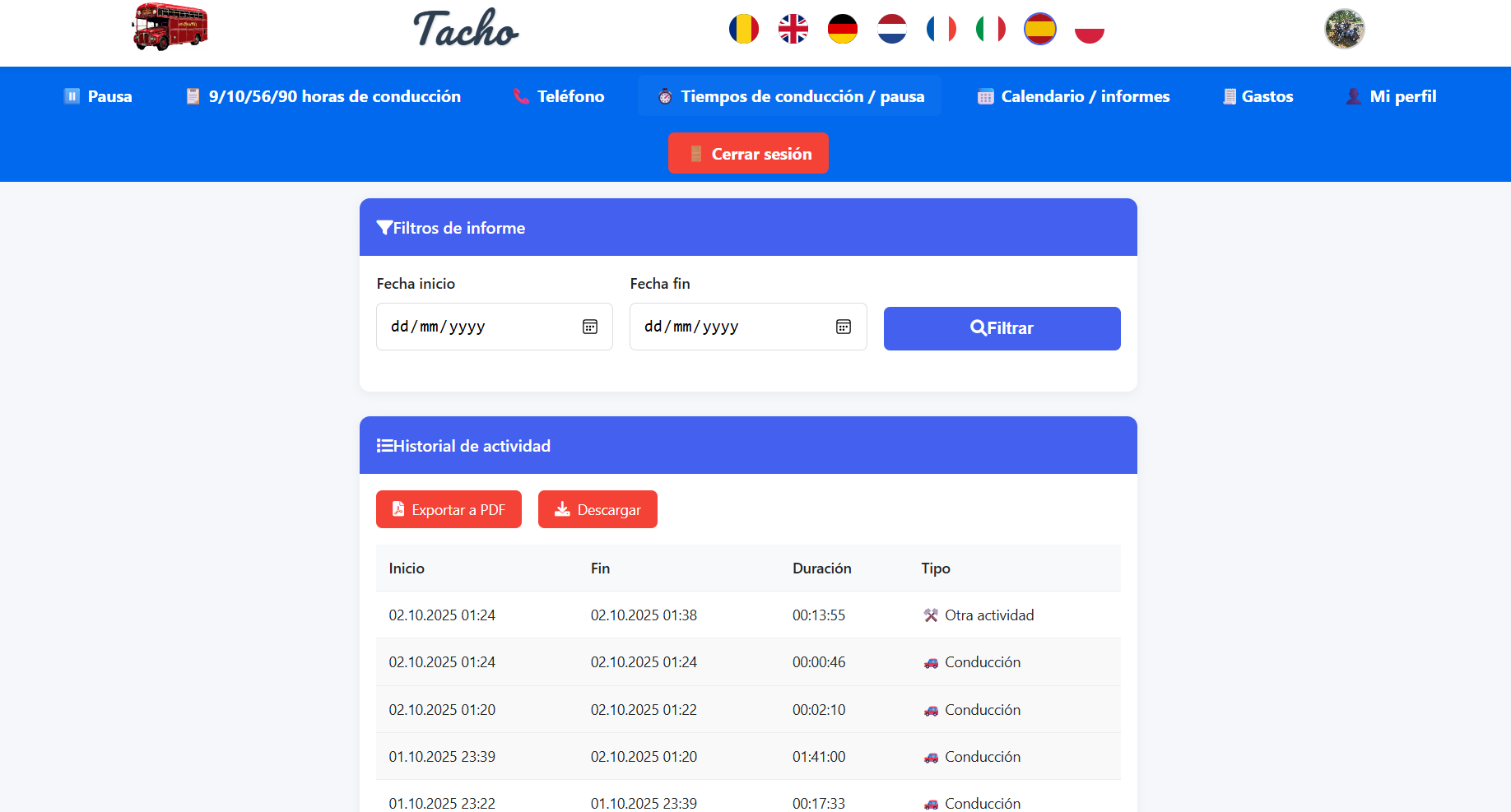 Esta aplicación está destinada a conductores profesionales y empresas de transporte que desean gestionar de forma eficiente los tiempos de conducción, pausas y actividades diarias.